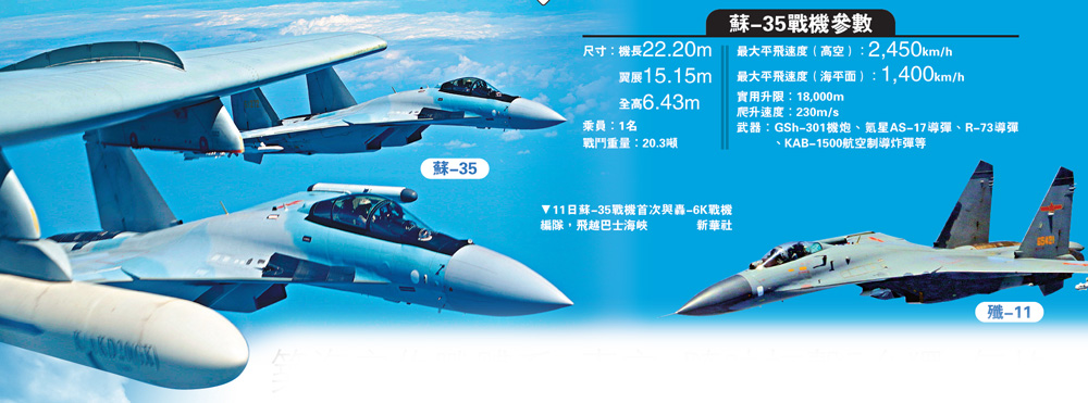 作为一款重型多用途战机,苏-35拥有较强的制空作战能力和较强的对地面海面目标的精确打击能力。机身上的感测器非常先进,可以获得大范围的空中态势。此次双向绕台亦是苏-35首度公开报道的深入太平洋展开演训,同时实现了绕岛巡航模式的新突破,彰显了空军体系作战能力的新提升。空军发言人申进科大校指出,空军苏-35战机首次与轰-6K战机编队飞越巴士海峡,见证了空军新型战机在海上方向实战化训练中不断飞出新航迹,提升了机动能力,检验了实战能力。他表示,在前出西太、绕岛巡航的机群中,新型战机将不断展翅大洋。