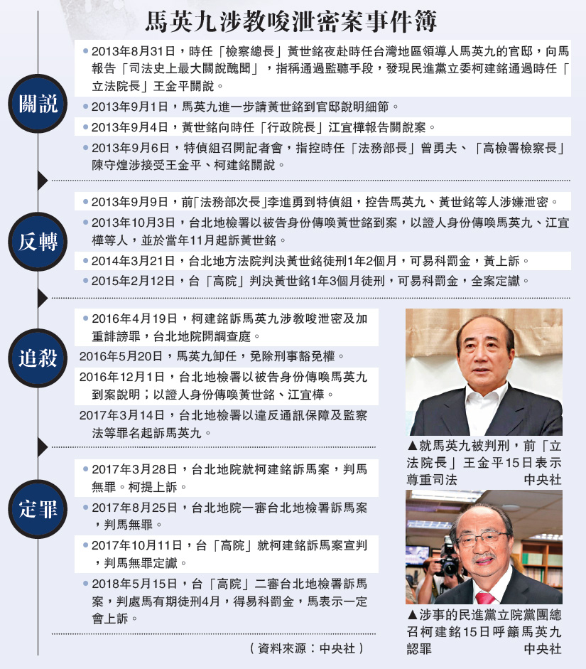 黄世铭2015年被依泄密罪判刑1年3个月、得易科罚金45万元(新台币,下同)定罪。马英九在卸任后免除刑事豁免权,北检2016年12月启动调查后认定,马英九为了撤销王金平党籍、拔掉王“立法院长”的资格而泄密;2017年3月14日,北检依涉刑法公务员泄密罪嫌、通讯保障及监察法、个人资料保护法三罪起诉马。