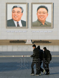 在朝鲜最高领导人金正恩迎来32岁生日的1月8日,朝鲜未举办大型活动进行庆祝。图为市民走在平壤金日成广场的巨幅肖像画前。(共同社)