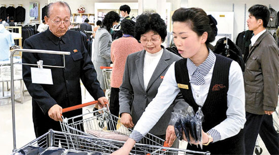 图为位于平壤普通江区域的未来商店,女店员正在向顾客推销袜子。朝鲜女性最近的经济活动比以前变得活跃。