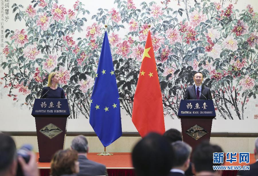 5月5日,国务委员杨洁篪在北京与欧盟外交和安全政策高级代表兼欧盟委员会副主席莫盖里尼共同主持第五轮中欧高级别战略对话。这是对话后,杨洁篪和莫盖里尼共同会见记者。新华社记者 丁林摄