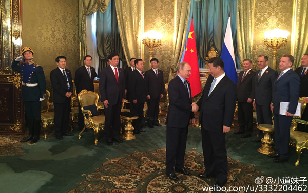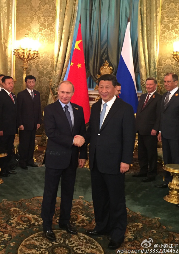 据凤凰卫视报道,普京表示特别高兴,能够在俄罗斯全民庆祝卫国战争胜利70周年的日子里接待习近平到访。两国是二战的最大受害者,牺牲的人数也最多。习近平说中俄当年共同抵御军国主义侵略付出惨痛的代价,结下了深厚的友谊。双方共同举办纪念活动就是为了警惕战争重演、维护世界和平。