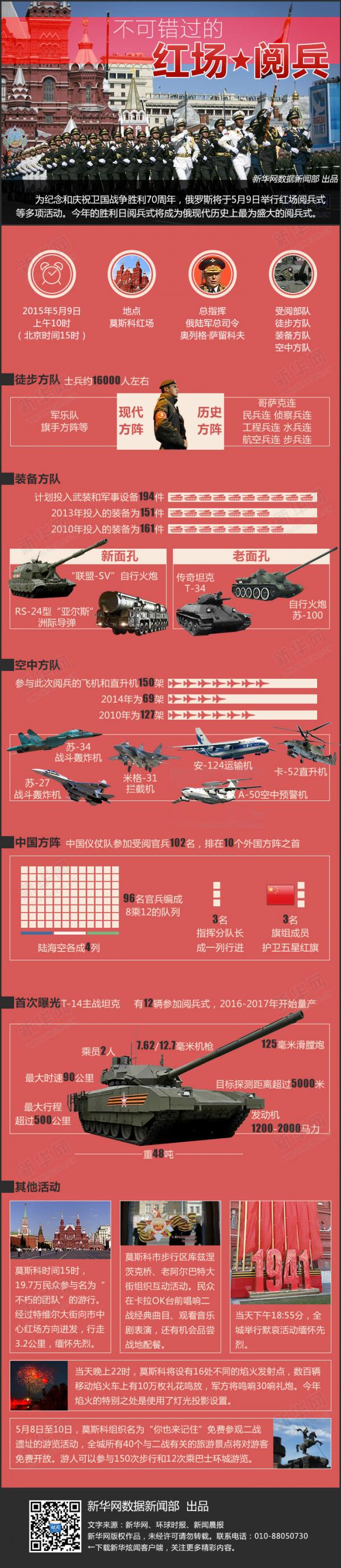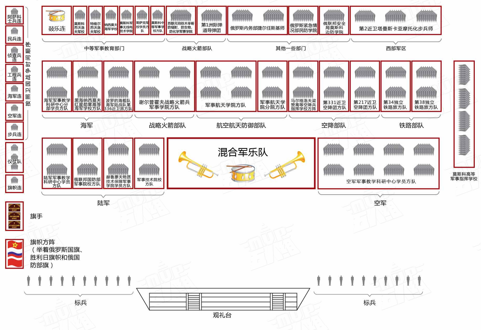 另据《京华时报》报道,国防大学装备专家葛立德教授介绍,此次红场阅兵在规模上创造了前所未有的新纪录。阅兵总指挥由俄罗斯陆军总司令奥列格 萨留科夫出任。受阅部队分为徒步方队、装备方队(机械方队)和空中方队三大板块。俄罗斯联邦武装力量集体亮相,军兵种力量齐全,联合一体。俄联邦武装力量中的陆军、海军和空军三大军种,以及空降兵、战略火箭兵和空天防御兵三大兵种,还有俄联邦政府各强力部门,如内务部内务部队、紧急情况部民防学院、安全局莫斯科边防学院和铁道兵,均派遣部队参阅此次红场阅兵,总人数超过16000人。