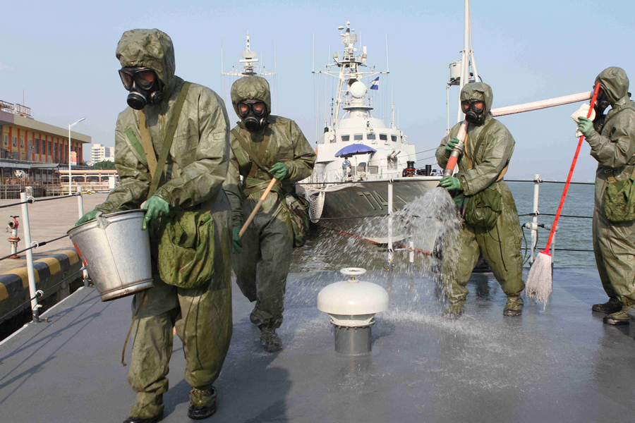 海上先锋艇上洗消训练。大公报记者贾磊摄
