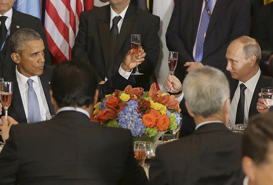 图:美国总统奥巴马(左)28日在联合国大会午宴上向俄罗斯总统普京敬酒/路透社