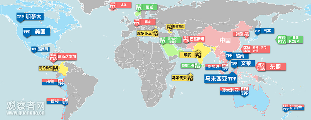 还有专家建议,以中国“轮轴—辐条形自贸网”破解TPP“网状自由贸易”,即利用中国与单一国家和地区签署的自贸协定,打破TPP的集团围堵,也不失为一良策。目前,中国已与TPP成员新西兰、秘鲁、新加坡、澳洲及韩国、东盟签署了自贸协定,未来,中国对外双边自贸协定和范围仍会扩大,这是现阶段中国打破TPP封锁的一把利器。