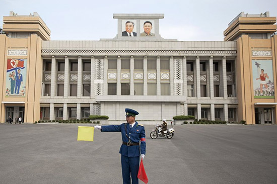 当地时间2015年10月8日,朝鲜平壤,警察在金日成竞技场前指挥交通。朝鲜将庆祝劳动党成立70周年。