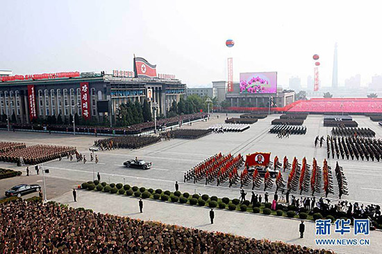 2012年10月10日,在朝鲜首都平壤,受阅部队接受检阅。朝鲜10日上午在平壤金日成广场举行盛大阅兵式,庆祝朝鲜劳动党成立65周年。新华社记者姚大伟摄