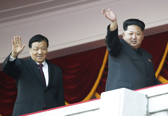 图:朝鲜领导人金正恩(右)与到访平壤的中共中央政治局常委刘云山10日在阅兵仪式看台上挥手\美联社