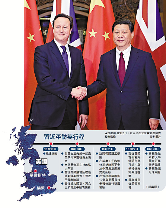 大公网10月19日讯 中国国家主席习近平于19日至23日对英国进行首次国事访问。习近平启程前夕接受英媒访问时表示,期待通过此次访问与英国一同开启中英全面战略伙伴关系的“黄金时代”。英国首相卡梅伦18日也透过中国媒体表达了对习主席的欢迎,并表示中英两国关系正处在一个重要时刻,充满“机遇”,英国想成为中国有力盟友,与中国一同进入“黄金时代”。