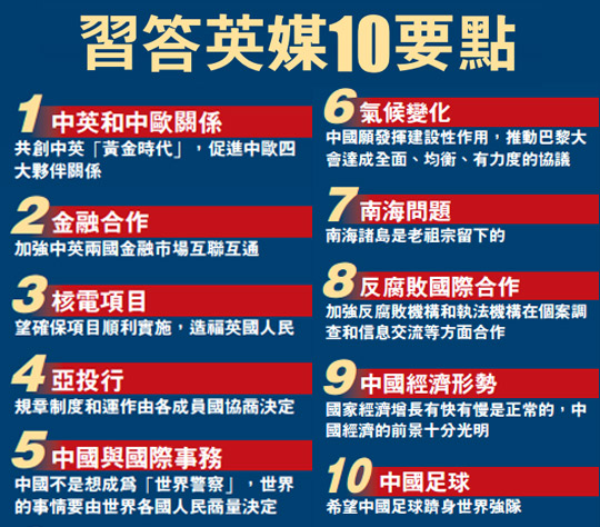 综合新华社、BBC、央视报道:中国国家主席习近平18日接受了路透社采访,就中英关系、两国金融合作、亚投行、南海问题、中国经济等回答了提问。