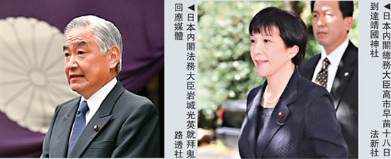 靖国神社17日至20日举行秋季例行大祭,岩城光英18日一早参拜神社,虽以私费捐奉,却在记帐本上写下“国务大臣岩城光英”。岩城表示:“是为向国家忠诚贡献出尊贵生命的英灵表示感谢之意参拜。”总务大臣高市早苗随后也进行了参拜。