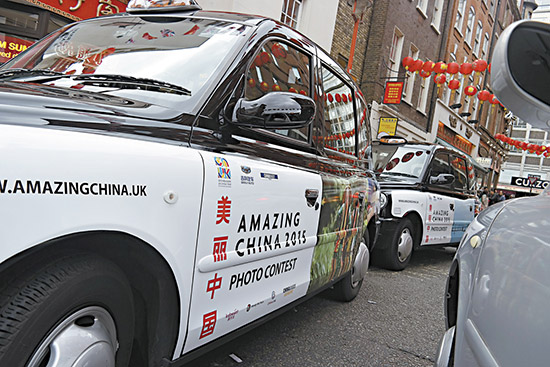图:50辆喷绘有“美丽中国”照片图案的英国出租车走上伦敦街头/中新社