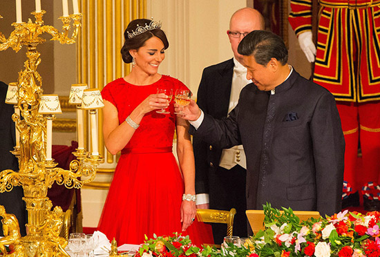 据英国《每日邮报》报道,20日当晚是凯特王妃首次出席国家宴会,她坐在仅次于英国女王的最显着位置,足可见迎接习主席的场面隆重。不仅如此,凯特王妃的精心着装也是独具匠心。报道称,凯特王妃身穿一袭红色定制锦缎长裙,很好地呼应了中国国旗的颜色。英国网民看到后高呼,凯特王妃璀璨红裙美极了。其实,仔细观察可以发现,此次习近平访英,夫人彭丽媛的着装也是格外用心,她身穿深蓝色长裙晚礼服,高贵美丽,被媒体称作“王室蓝”,其形象同样令很多英国网民倾倒。两位夫人的“默契”似乎更映衬出此次习主席访英的热烈友好氛围。