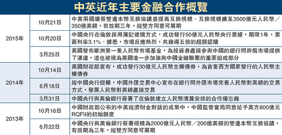 目前,中国央行已与逾30个国家和地区签署货币互换协议。而自2012年正式启动伦敦金融城人民币业务中心计划以来,中英双方一直合作无间,英国着力把伦敦打造成人民币国际市场的“西方中心”,中国金融机构也积极表现出与英方合作的意愿。