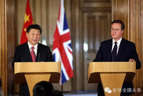 10月21日,国家主席习近平在伦敦唐宁街首相府同英国首相卡梅伦举行会谈。这是会谈结束后,习近平和卡梅伦共同会见记者。新华社记者鞠鹏摄