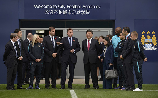 综合报道:在英国首相卡梅伦的陪同下,习近平参观了足球历史展,观看曼彻斯特城足球俱乐部球员培养和比赛数据分析系统的展示,观摩俱乐部一线球员训练比赛。