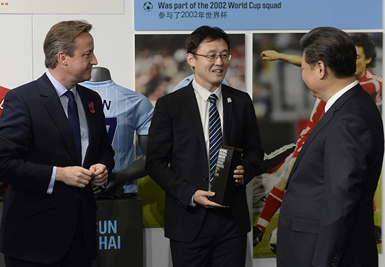 习近平还会见了前曼城队中的中国球员孙继海,孙继海在当天正式入选英格兰足球名人堂。在颁奖现场,习近平与他亲切握手交谈,英国首相卡梅伦也为孙继海献上掌声。孙继海在2002年加盟曼城,之后成为第一位在英超亮相的中国球员。