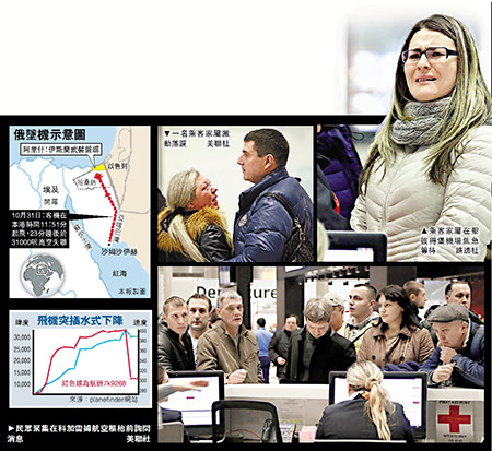 俄国客机坠毁西奈半岛后,乘客家属开始抵达俄罗斯圣彼得堡的普尔科沃机场,并暂时被统一安置进紧急中心。媒体称名单中很多人同姓,意味着其中很多人为全家出游,埃及是俄罗斯游客传统的热门旅游目的地。