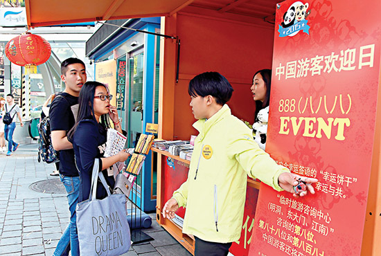 图:2015年10月6日是韩国首尔的中国游客欢迎日,中国游客在明洞进行旅游咨询/新华社