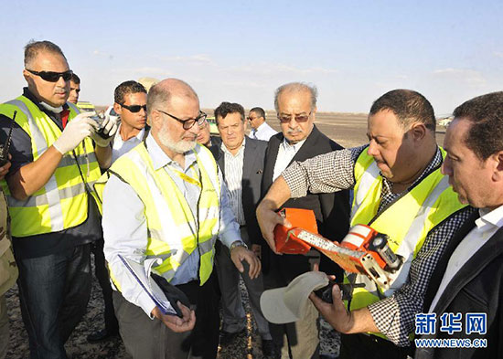 10月31日,在埃及西奈半岛阿里什地区南部的哈桑纳山区,埃及总理谢里夫·伊斯梅尔(右三)与救援人员一起查看俄罗斯失事飞机的黑匣子。新华社发(埃及总理府供图)