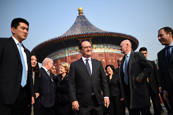 11月3日,正在中国进行国事访问的法国总统奥朗德在北京参观天坛/新华社