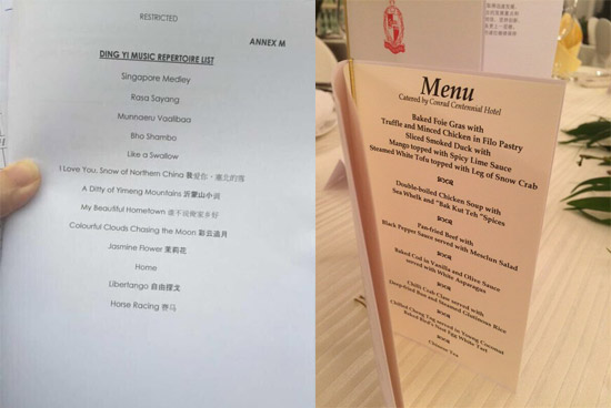 负责在国宴上演奏的是鼎艺团,将以由四首南洋风的民族歌曲如《RasaSayang》、《MunnaeruVaalibaa》、《BhoShambo》和《LikeaSwallow》所组成的组曲开始。