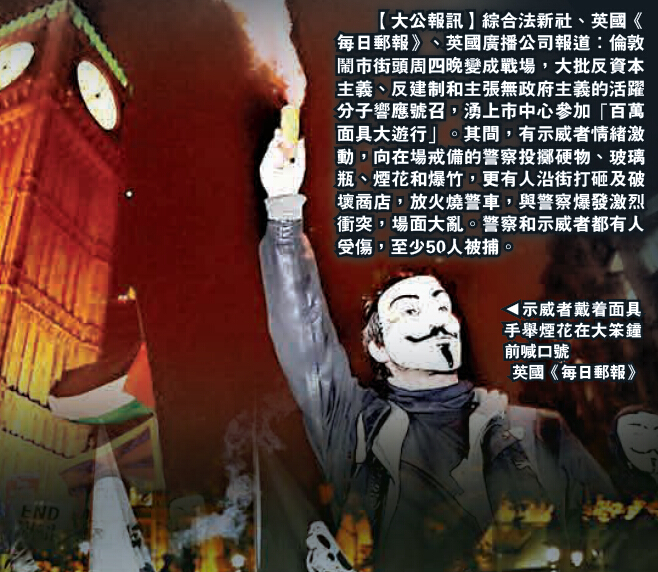 大公网11月7日讯 综合法新社、英国《每日邮报》、英国广播公司报道:伦敦闹市街头周四晚变成战场,大批反资本主义、反建制和主张无政府主义的活跃分子响应号召,涌上市中心参加“百万面具大游行”。其间,有示威者情绪激动,向在场戒备的警察投掷硬物、玻璃瓶、烟花和爆竹,更有人沿街打砸及破坏商店,放火烧警车,与警察爆发激烈冲突,场面大乱。警察和示威者都有人受伤,至少50人被捕。