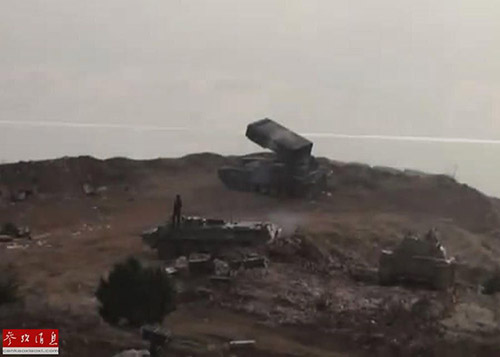 叙利亚军方电视台拍摄的参加实战的俄军TOS-1A喷火坦克(资料图)