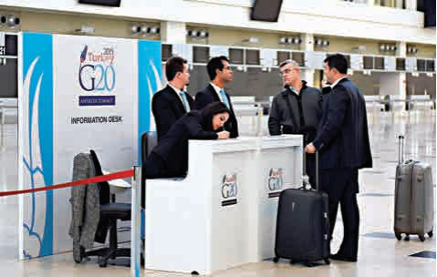 图:11月11日,在土耳其安塔利亚机场,工作人员为参加二十国集团领导人第十次会议的代表提供咨询/新华社