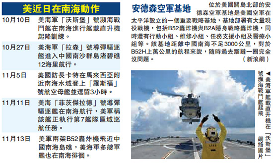 路透社引述美国防部发言人彼得.库克12日在新闻发布会上说:“B52轰炸机经常在那一片国际空域(指南海)进行正常巡逻飞行。”