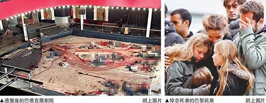大公网11月16日讯 综合英国《每日邮报》、《卫报》报道:巴黎遭遇“黑色星期五”的连环袭击后,死伤最惨重的巴塔克兰剧院相关片段陆续曝光。其中一段影片显示,法国警员与手持机枪的恐怖分子在剧院外激烈驳火,亦有影片显示绝望的孕妇试图爬窗逃离剧院。另外,遇袭后拍摄的一张照片,清晰可见剧院内部染了大量鲜血,满地尸体。