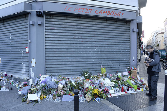 图:十五日,遭受恐怖袭击的柬埔寨餐馆堆满了鲜花/法新社