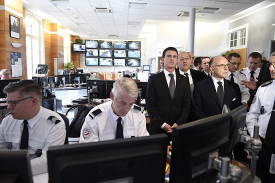 图:法国总理曼努埃尔瓦尔斯、内政部长伯纳德和国防部长勒德里安在巴黎警察指挥中心/法新社