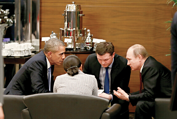图:15日,俄罗斯总统普京(右)与美国总统奥巴马(左)单独会谈/美联社