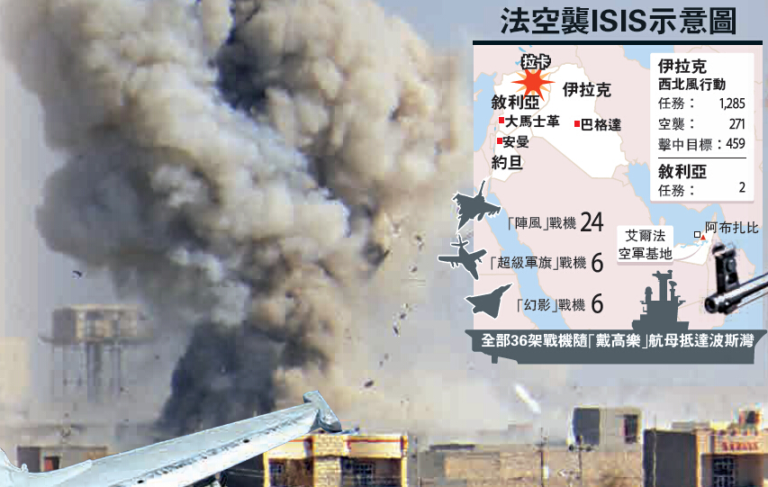 但在恐怖分子持AK47步枪,绑自杀式炸弹背心杀入巴黎大屠杀后,法国以15日的空袭向世界发表清楚信号:法国剿灭ISIS决心坚定,亦有能力在境外实施攻击。法国外长法比尤斯说,法国决定展开报复性空袭属“自卫”行为。