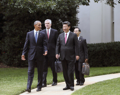 图:今年9月,习近平同奥巴马在白宫廷院里交谈资料图片