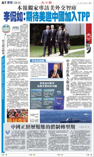 大公报11月18日讯(记者孙志、谭笑) 中国国家主席习近平和美国总统奥巴马赴马尼拉出席APEC领导人峰会,外界普遍预测,跨太平洋伙伴关系协议(TPP)将成为峰会一大看点。美国泰斗级的中国问题智库李侃如在接受大公报独家专访时指出,美国有极大可能在明年4月决定是否正式加入TPP,“若美成功加入,我个人十分期待美国邀请中国加入TPP。”在回应有关南海问题时,李侃如表示,美中关系在全球范围内非常重要,并会强势影响世界的发展,两国的利益是兼容的;就目前来看,两国政府在整体关系上都努力避免出现大的问题。