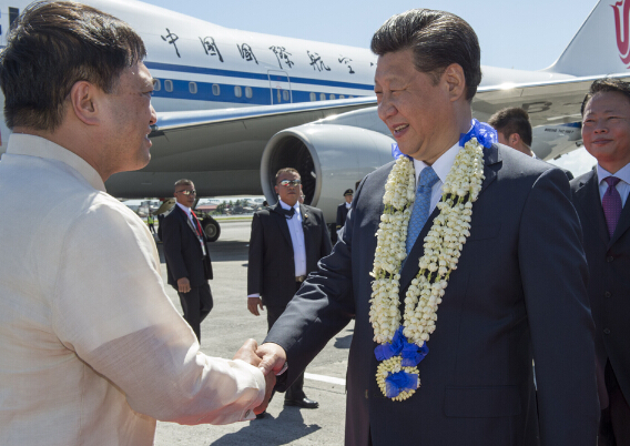 当地时间中午12时许,习近平乘坐的专机抵达马尼拉机场。菲律宾财政部长等政府高级官员到机场迎接。香港特首梁振英、中国驻菲大使赵鉴华也到机场迎接。