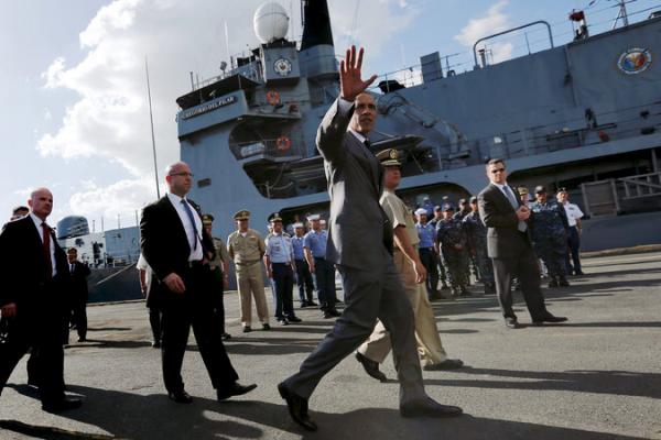 奥巴马登上停泊在码头的“德尔毕拉尔”号护卫舰