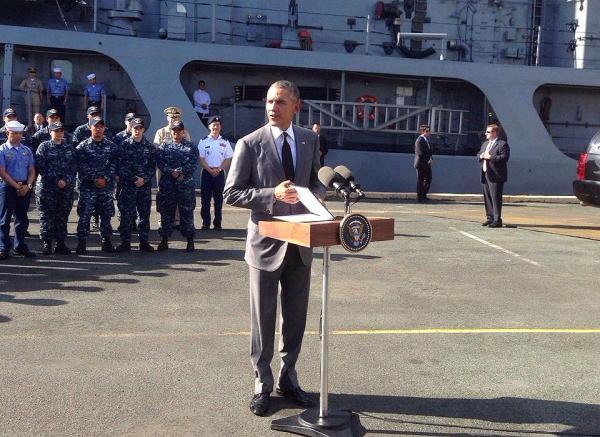 奥巴马当天在马尼拉登上由美国赠送菲律宾“德尔毕拉尔”号护卫舰,并与菲方军官交谈。而在随后的记者会上,奥巴马直接表明了本次参观的目的。