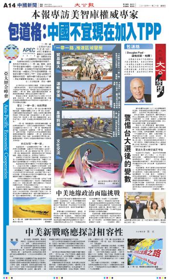 11月20日大公报A14版整版报道:大公独家专访美智库权威专家包道格