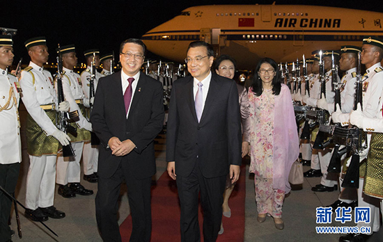当地时间11月20日晚,应东盟轮值主席国马来西亚总理纳吉布邀请,国务院总理李克强乘专机抵达吉隆坡雪邦国际机场,将出席第十八次中国-东盟(10+1)领导人会议、第十八次东盟与中日韩(10+3)领导人会议和第十届东亚峰会,并对马来西亚进行正式访问。李克强总理夫人程虹同机抵达。马来西亚交通部长廖中莱等政府高级官员到机场迎接。新华社记者黄敬文摄