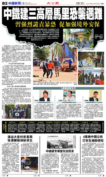 大公网11月22日讯 11月20日西非国家马里发生武装人员大规模劫持人质事件,截至发稿时,事件共造成27人遇难,其中包括3名中国铁建高级管理人员。中国国家主席习近平作出重要批示,要求有关部门加大投入和保障,加强境外安全保护工作,确保中国公民和机构安全,中国坚决打击残害无辜生命的暴力恐怖活动。国务院总理李克强向中方遇难人员家属表示深切慰问,要求有关部门做好后续工作,加强中方驻外安防,保护好中方在外人员。