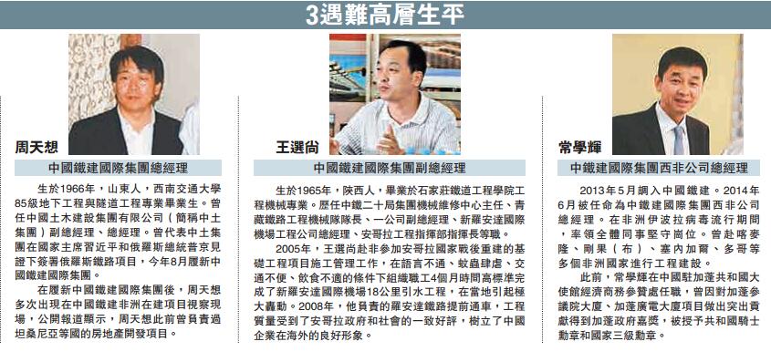 生于1966年的周天想今年8月才履新中铁建国际集团,多次出现在中国铁建非洲在建项目视察现场,公开报道显示,周天想此前曾负责过坦桑尼亚等国的房地产开发项目。副总经理王选尚,曾负责安哥拉罗安达铁路的建设项目,受到过安哥拉政府部门的好评。另一高管常学辉自2013年之后曾赴喀麦隆、刚果(布)、塞内加尔、多哥等多个非洲国家进行工程建设。