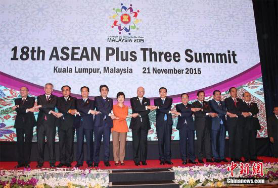 当地时间11月21日下午,中国国务院总理李克强在吉隆坡国际会议中心出席第十八次东盟与中日韩(10+3)领导人会议,东盟十国领导人以及韩国总统朴槿惠、日本首相安倍晋三共同出席。马来西亚总理纳吉布主持会议。中新社记者 刘震 摄