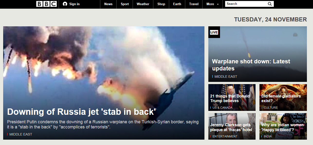 对于俄军机在叙坠毁一事,俄土说法不一。俄国防部发布消息称,一架俄罗斯苏-24战机在叙土边境附近叙利亚境内坠毁,疑似被地面武器击落。土耳其方面则表示,他们用F16战机击落了这架军机,因为它“侵犯了土耳其领空”。