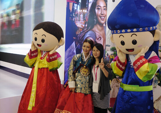 图:近年来韩国成为中国游客海外游热门地。图为今年上海旅博会上观众与身穿韩国传统民族服饰的旅游业展商合影 资料图片