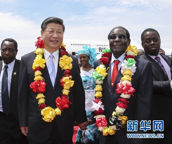 穆加贝在机场举行隆重欢迎仪式。军乐队奏中国国歌,鸣21响礼炮。在穆加贝陪同下,习近平登上检阅台。习近平检阅仪仗队,军乐队奏津巴布韦国歌。津巴布韦儿童向习近平和穆加贝献上花环,向彭丽媛和穆加贝夫人献上鲜花。前来参加欢迎仪式的津巴布韦政府内阁部长、外国驻津使节等在红地毯旁列队,当地民众跳起欢快热情的传统舞蹈,欢迎习近平和彭丽媛到访。在机场通往下榻酒店的街道沿途,数万津巴布韦民众载歌载舞,夹道欢迎习近平和中国代表团。