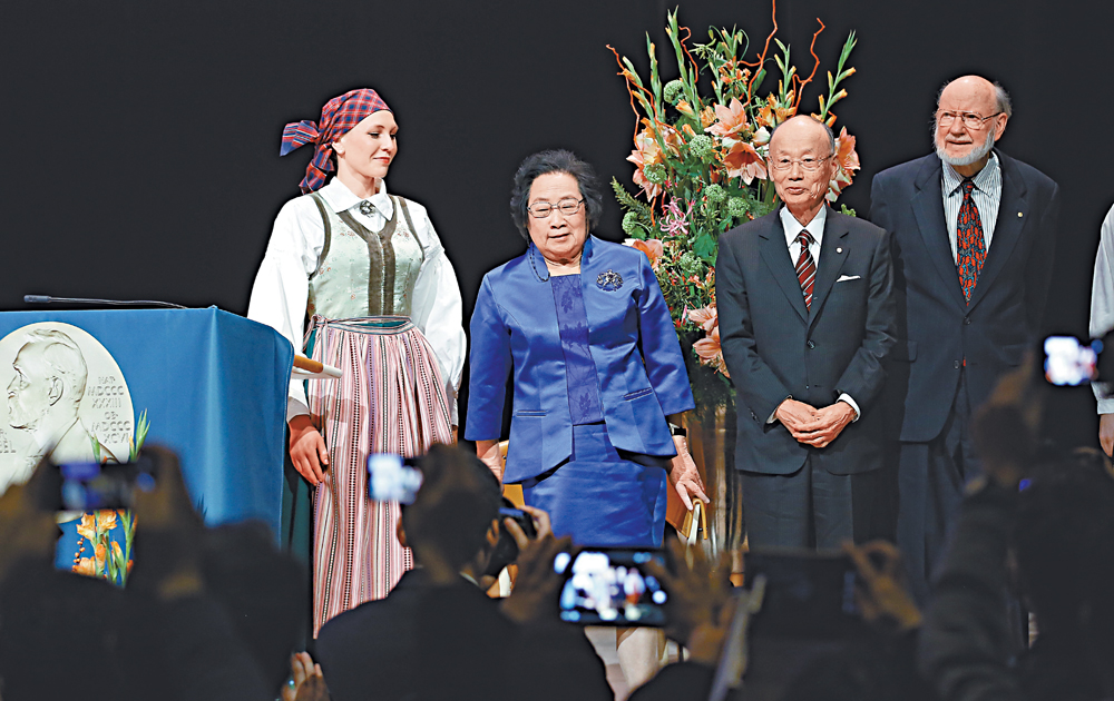 图:7日,中国科学家屠呦呦(左二)、日本科学家大村智(左三)和美国科学家威廉.坎贝尔(右一)在演讲结束后合影\新华社